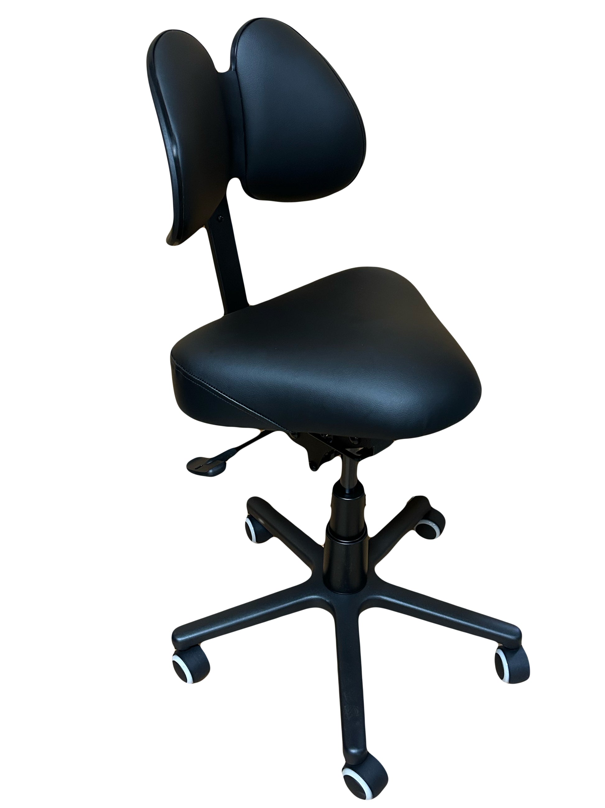 The NEW 400-Hybrid combines the patented split backrest design with a redesigned soft foam triangular shaped seat cushion designed to provide excellent comfort but also allow your legs to fall more for closer access to the patient and less fatigue underneath the thigh. Built with the same hydraulic mechanism used in our chairs, the seat and back can "float" following ones' movement. This style seat works for those who like the concept of a saddle seat but may not be able to get used to that hump in the middle of the saddle so they resort to a halfway saddle here with the Hybrid.