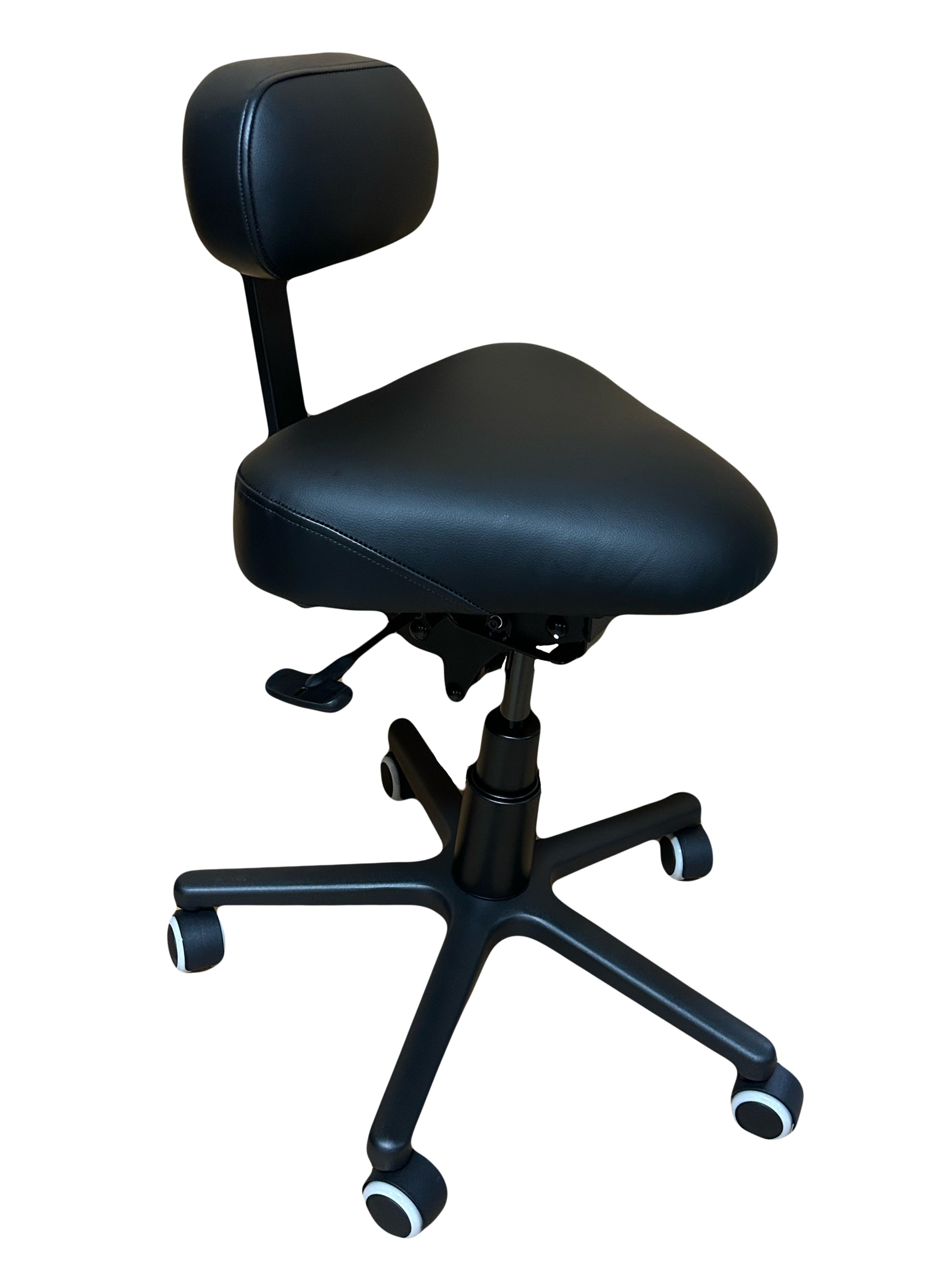 The NEW Flex-Hybrid combines the single pad centered backrest design with a redesigned soft foam triangular shaped seat cushion designed to provide excellent comfort but also allow your legs to fall more for closer access to the patient and less fatigue underneath the thigh. Built with the same hydraulic mechanism used in our chairs, the seat and back can "float" following ones' movement. This style seat works for those who like the concept of a saddle seat but may not be able to get used to that hump in the middle of the saddle so they resort to a halfway saddle here with the Hybrid.