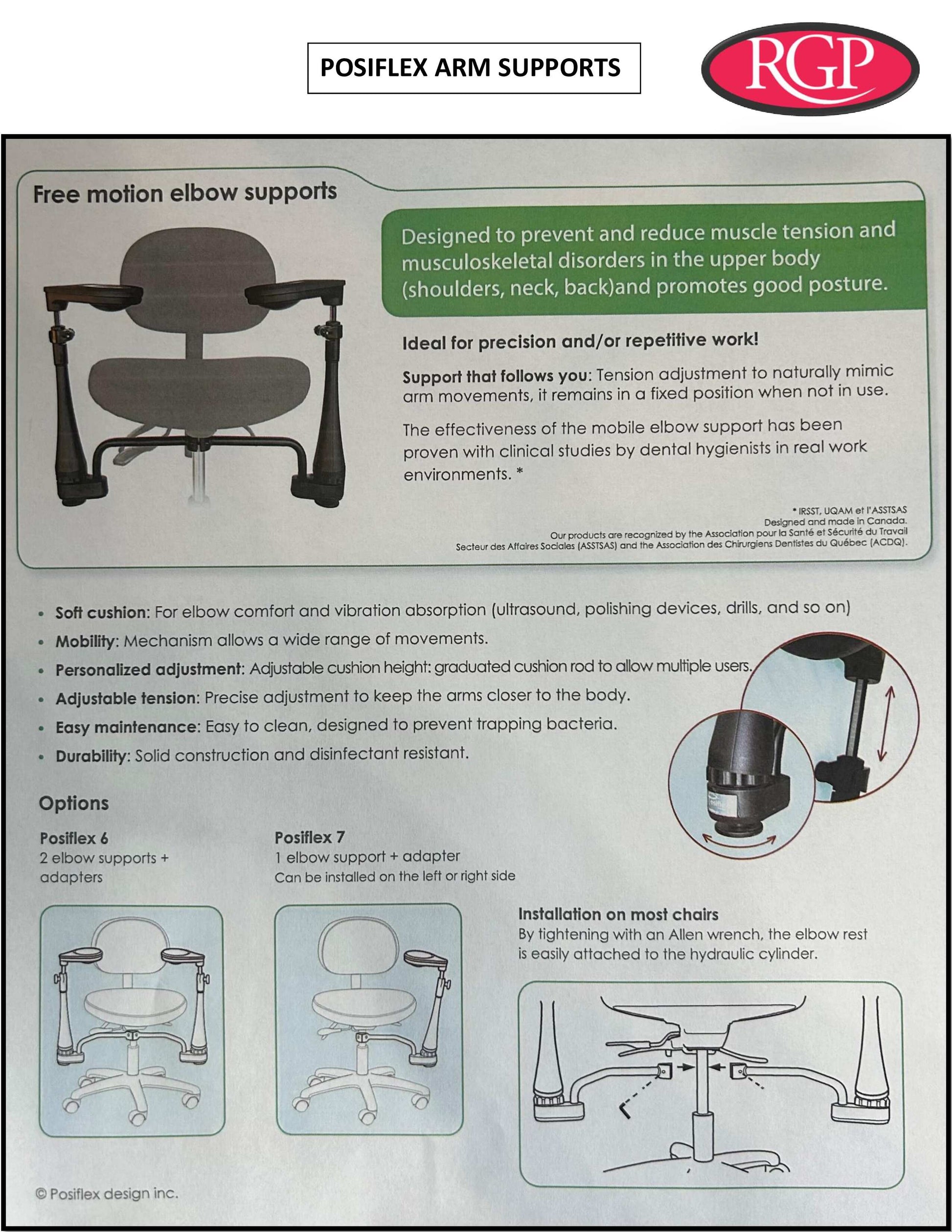The Posiflex Armrests (double) is a set of dynamic armrests that allows the user unlimited motion in both arms. In and out, left to right, circular, and much more, the Posiflex Armrest literally follows the user wherever their arms go. With tension motion adjustments, height markers to mark the height of the arms, and a gel soft arm pad that can be used for an elbow or forearm rest, the Posiflex Armrest (double) is a great option for people who want fluid support on both arms. The sleek design keeps the overall chair dimensions at a minimum as well. Armrests can be added to any chair. RGP chairs as well as other brands.